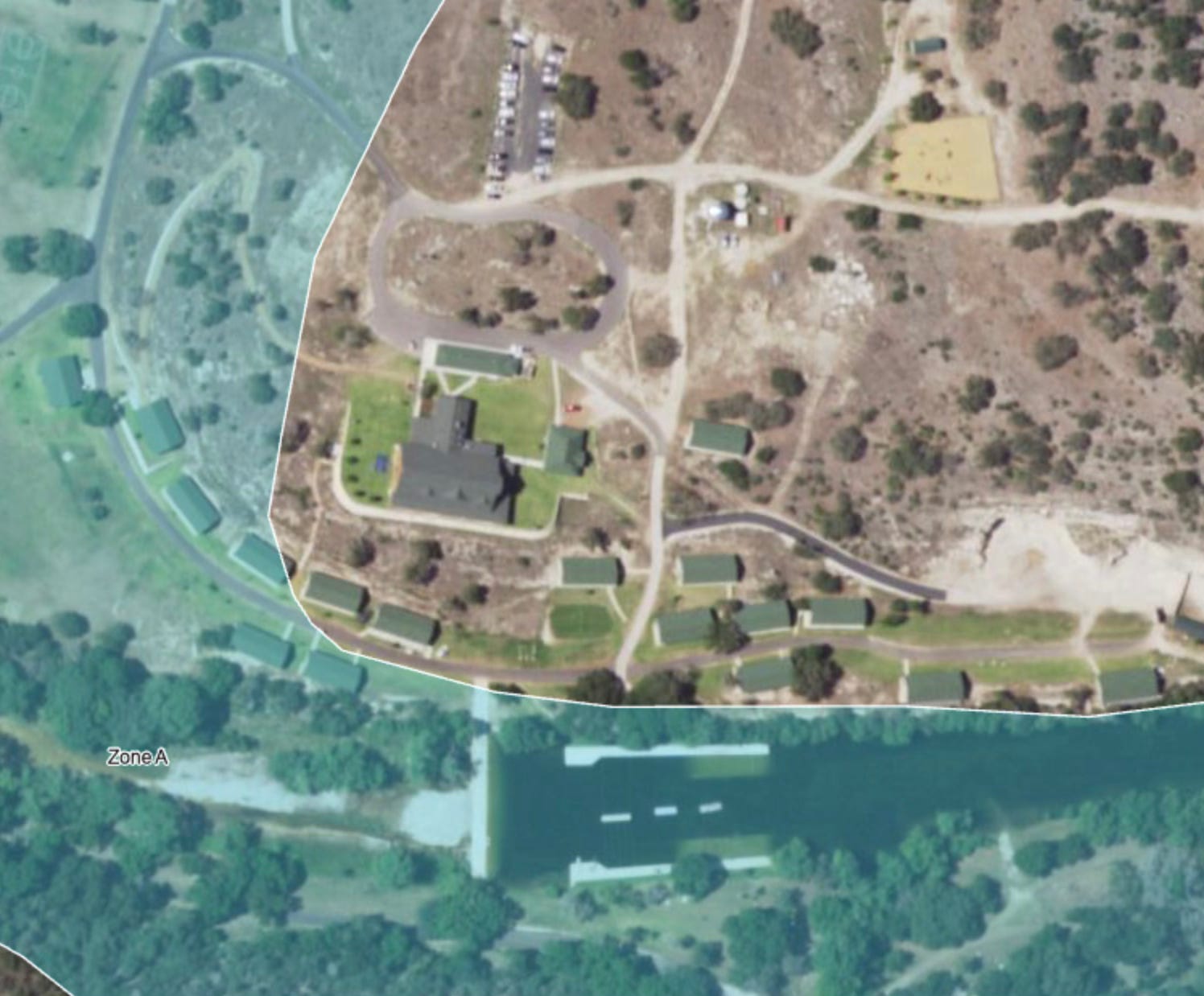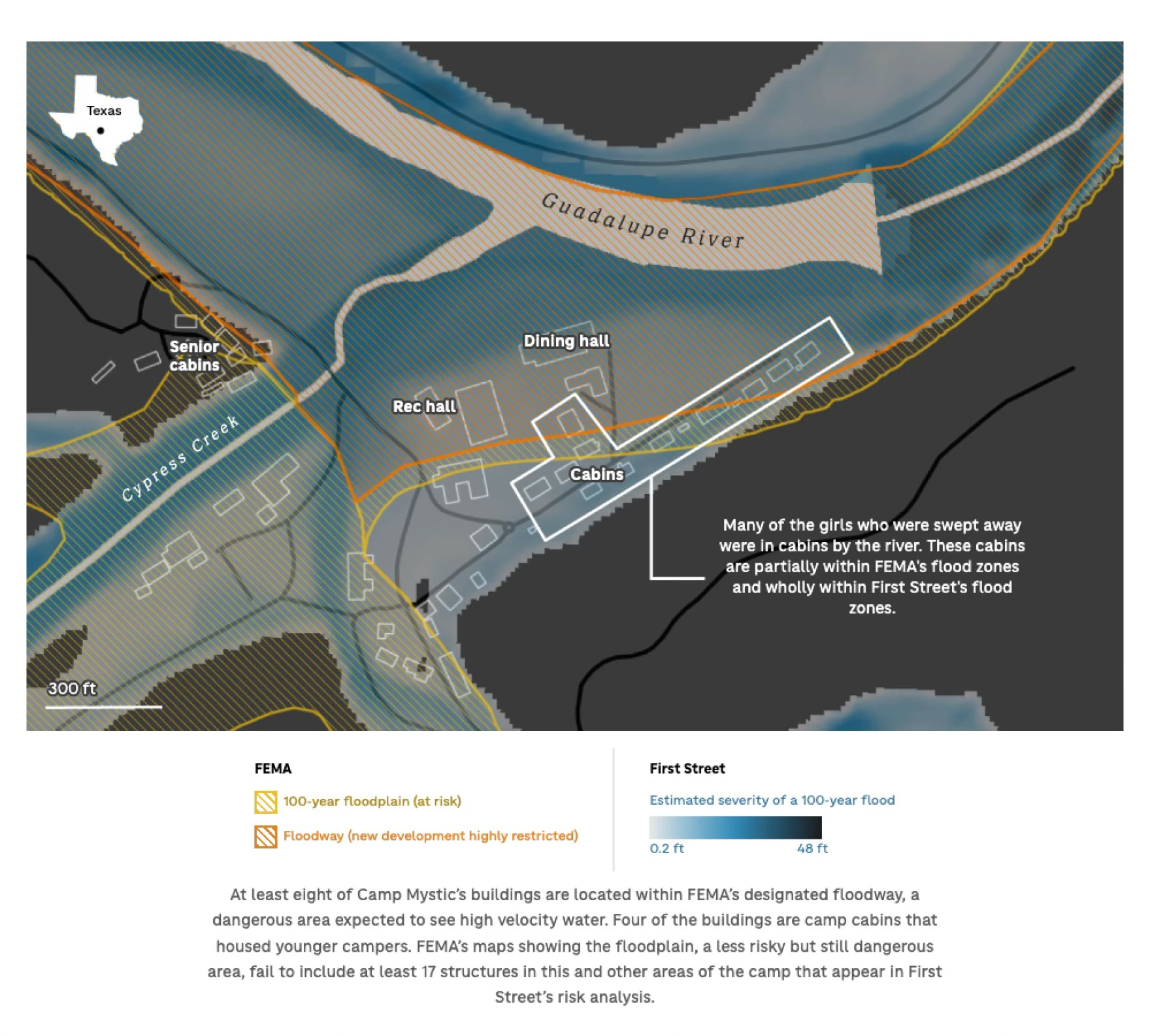 İşte FEMA’dan bir ekran görüntüsü harita Yatrilen renklerde “sel” (suyun bir sel sırasında hızlı hareket ettiği bölgeyi) ve 100 yıllık sel bölgesini mavi olarak gösteriyor. Burası kızların çoğu hareketli su ile süpürüldü. Kabinlerin bazıları sel bölgesinin bir parçası olarak kabul edilmeyen turuncu veya gölgesiz alanlarda idi.