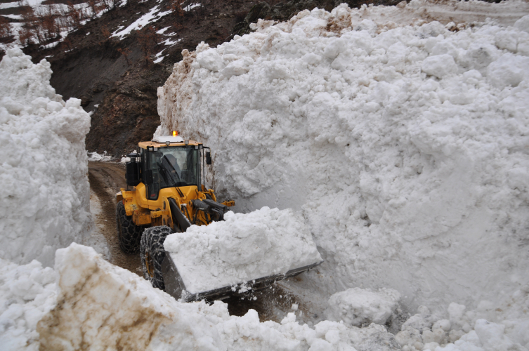 İhbar üzerine bölgeye yönlendirilen İlçe Özel İdaresi ekipleri, metrelerce karın bulunduğu yolda iş makineleriyle çalışma yürütüyor.