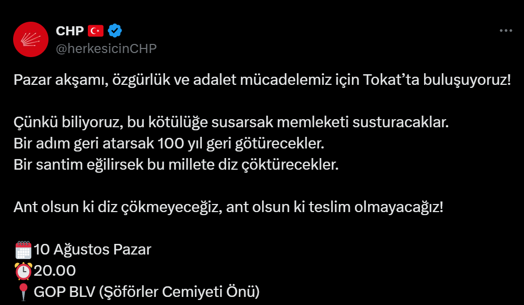 Partiden sosyal medya hesaplarından, “Pazar akşamı, özgürlük ve adalet mücadelemiz için Tokat’ta buluşuyoruz! Çünkü biliyoruz, bu kötülüğe susarsak memleketi susturacaklar. Bir adım geri atarsak 100 yıl geri götürecekler. Bir santim eğilirsek bu millete diz çöktürecekler. Ant olsun ki diz çökmeyeceğiz, ant olsun ki teslim olmayacağız!” ifadeleriyle duyurulan mitingin saat 20:00’da Gaziosmanpaşa Bulvarı’ndaki Şöförler Cemiyeti Önü’nde yapılacağı açıklandı.