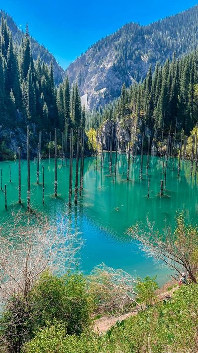 Orta Asya’nın Tian Shan dağlarındaki bir kanyonda, bir ormanın neredeyse tamamı su altındadır. Kaindy Gölü olarak anılan bu göl, Kazakça dilinde “huş ağacı” anlamına gelir, ancak ağaçlar aslında Asya ladinleridir. Bu, dünyayı sarsacak bir köken hikayesine sahip, az bilinen bir cennettir.