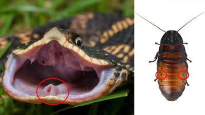 Bu Doğu Hognose (solda) kendini daha büyük göstermeye ve glottisini göstermeye çalışıyor. Madagaskar tıslama hamamböceği (sağ) spiracles vücutta çift olarak görülebilir.