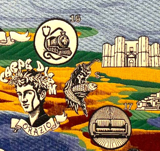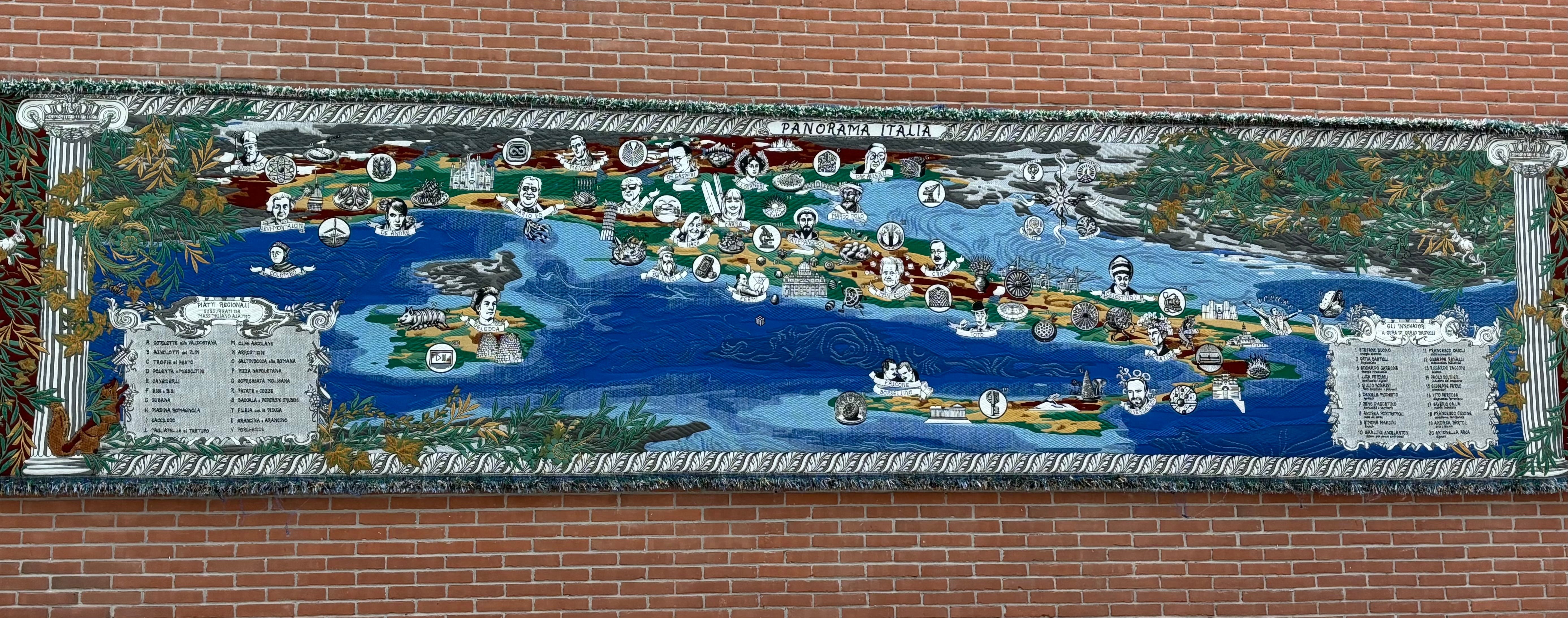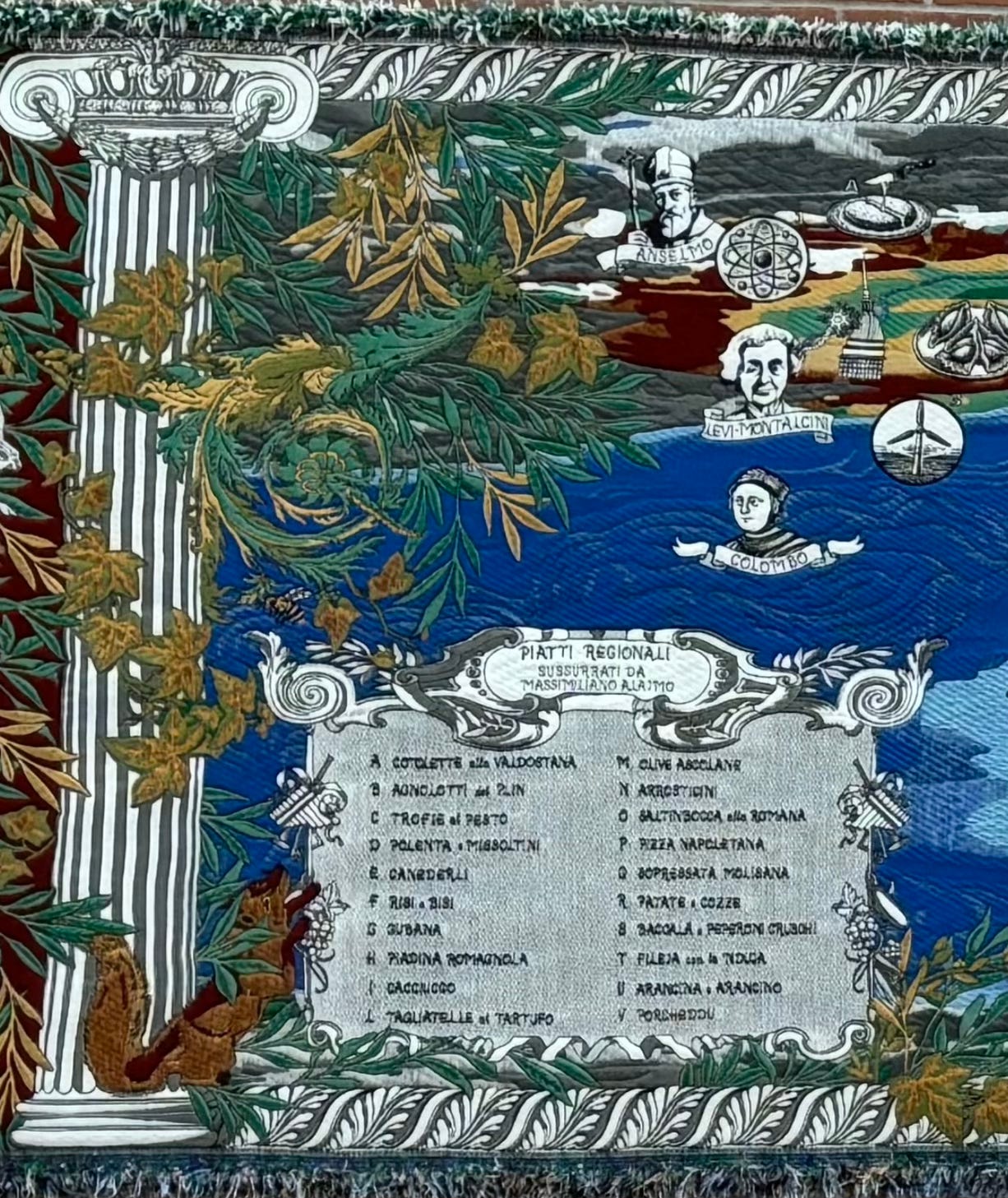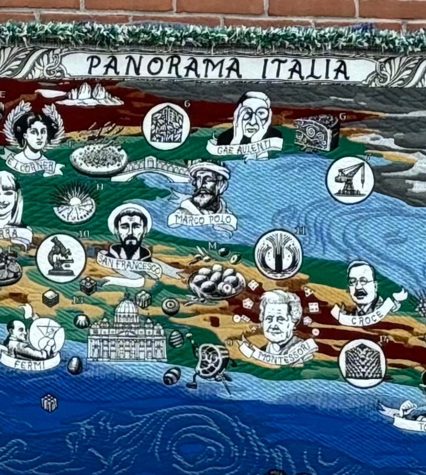 Genellikle haritaların arkasında ilk bakışta belirgin olmayan ilginç bir hikaye var. Özellikle harita uzun süre oyalayamayacağı havaalanı güvenlik hattına giderken asılı kaldığında. Bu goblen, İtalyan Olimpiyat Komitesi tarafından 2024 Olimpiyatları için Paris’teki İtalya’nın sporcularına ev sahipliği yapan Casa Italia’ya asmak için görevlendirildi. Tekstil üreticisi Fabrikası Lenta’nın yaratıcı direktörü Giovanni Bonotto projeyi yönetti. 1956’dan kalma ahşap mekanik servis tezgahlarında dokunuyordu. Harita İtalyan yenilikçilerini, mimariyi, endüstri, bölgesel ürünleri ve yiyecekleri sergiliyor.